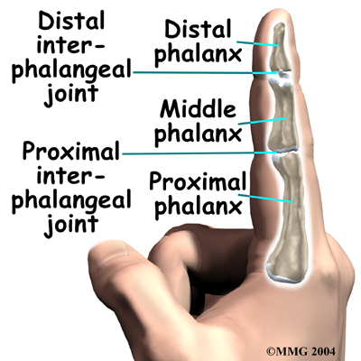The fingers are actually made up of , called phalanges. The three phalanges in each finger are separated by two joints, called interphalangeal joints (IP joints). The joint near the end of the finger is called the distal IP joint (DIP joint). (Distal means further away.)