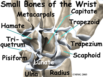 One reason that the wrist is so complex is that every small bone forms a joint with the bone next to it. This means that what we call the wrist joint is actually many small joints. Ligaments connect all the small bones to each other, and to the radius, ulna, and metacarpal bones.