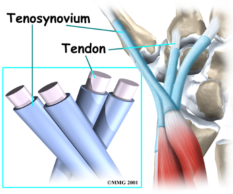 Most of the tendons around the wrist are covered with a thin tissue called tenosynovium. Tenosynovium is very slippery. It allows tendons to glide against one another and the surrounding muscles, fat, and skin with very little friction.
